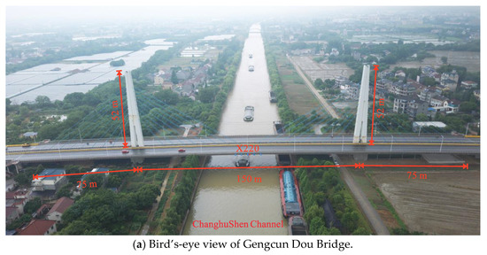 The Gengcun Dou Bridge (Figure 5a) is located in Gengcun, Changxing County, Huzhou City, China, along the Changxing–Lvshan Line (X220), spanning over the ChanghuShen Channel. The main bridge is a double-tower cable-stayed bridge, while the approach bridges at both ends consist of 5 spans of continuous prestressed concrete box girder bridges with equal cross-sections. The total length of the bridge is 608.25 m, with the following span combination: 5 × 30.0 m (north approach bridge) + 75.0 m + 150.0 m + 75.0 m (main bridge) + 5 × 30.0 m (south approach bridge). The main tower is constructed using steel box sections, with dimensions of 3.4 × 7.984 m at the bottom and 2.87 × 2.88 m at the top, standing 52.8 m above the bridge deck. It utilizes longitudinal stiffening ribs and cross-strengthening ribs to ensure stiffness. The completely symmetrical cable system comprises 64 cables arranged in a fan shape, utilizing the parallel wire cable system. The detailed features of the stay cables are presented in Table 1. The main girder of the bridge is designed as a triangular box structure with three chambers, comprising top and bottom plates, diagonal and vertical webs, a cantilever plate, and transverse bulkheads. The net width of the girder is 32.5 m at the top and 4 m at the bottom, with specific thicknesses specified for each component.