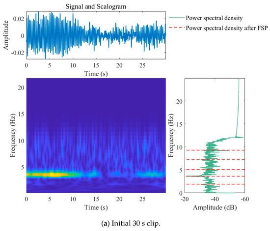 The graphical depiction presented in Figure 7 showcases the results of the time–frequency spectrum post the FSP method. The FSP method is a technique used to improve the readability of signals in the frequency domain. The computational parameters utilized for this study were carefully selected to achieve accurate and reliable results. The step size, a parameter that controls the time resolution of the analysis, was set to 101. The exponentiation order , which controls the frequency resolution, was set to 50. The frequency convergence threshold, which is used to stop the iteration process, was set at a value of . Finally, the total number of iterations was set to 1000. The resultant spectrum demonstrates a high concentration of energy at the accurate position of the natural frequency (red dashed lines in Figure 7). This indicates that the FSP method successfully identified the target frequency with minimal distortion. This feature is crucial in many applications where accurate frequency identification is necessary. In conclusion, the FSP method is a reliable and effective technique for analyzing signals in time and frequency domains. Its ability to reduce distortion in the target frequency pickup makes it highly valuable in many applications, including those in the fields of engineering, physics, and medicine.