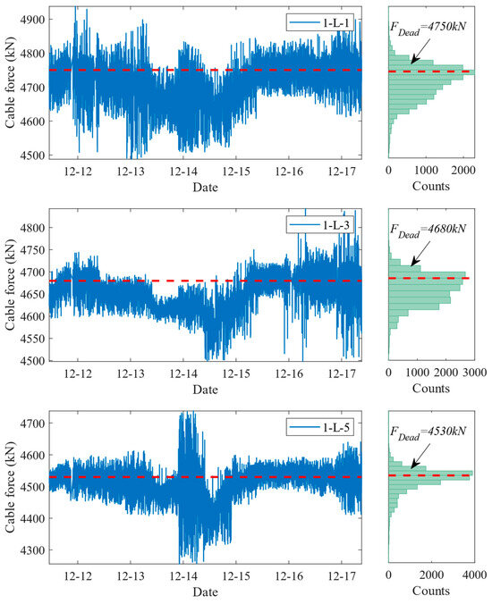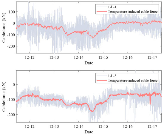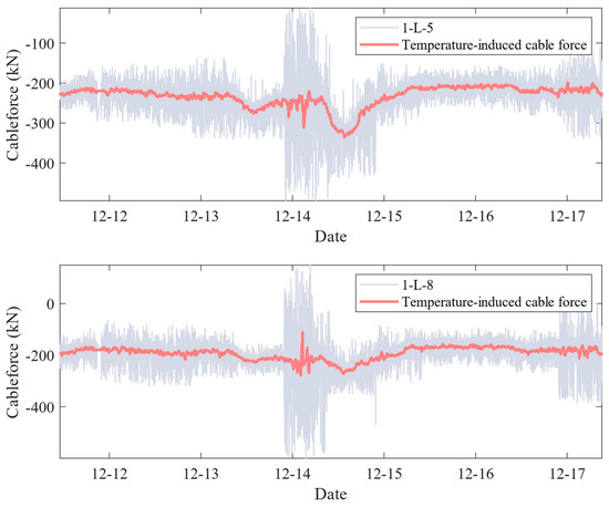 It is widely acknowledged that the total load sources affecting stay cables in service primarily stem from slow-trend and fast-trend sources [41,42,43]. More specifically, fast-trend load sources resulting from cable force changes are predominantly influenced by traffic and wind loads, while slow-trend load sources arising from cable force changes are mainly influenced by temperature and dead-load factors. Figure 8 shows the monitored cable forces (response) and estimated cable forces due to dead loads for a week in service. It is seen from the left-hand panel of Figure 8 that long-term cable forces comprise two components: the slow-trend variation and fast-trend components.