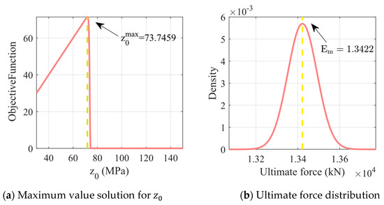 Notably, Section 2.3 considers uncertainties associated with strength properties to adequately describe the resistance properties of the stayed bridges at Gengcun Dou Bridges. The stay cables are all of the size of PESM 7-187 (). In testing, a batch of high-tensile steel wires with a wire length of 500 mm was tested in 15 groups. Given that the specimen steel wires are of the same length and shorter, the scale parameter was set to 1. Referring to Equation (12), we obtained a solution satisfying the extreme value problem, resulting in a Weibull distribution shape parameter of 73.7459 kN and a scale parameter of 194.90 kN, as shown in Figure 12a. By combining Equations (8) and (9), we derived the mean value of the ultimate load-carrying capacity of the whole cable as 13,422 kN, with a standard deviation of 70.04 kN, as shown in Figure 12b.