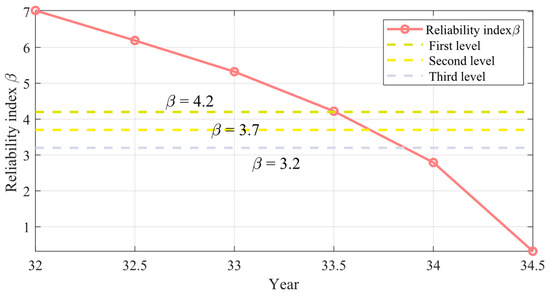 Figure 13 illustrates the reliability analysis results of the GP model-based method for 1-L-1. The GP model-based adaptive method relies on iteratively constructing models that approximate the limit-state function. These surrogates are adaptively refined by incorporating limit-state function evaluations into their experimental designs until a suitable convergence criterion is reached, related to the accuracy of the probability of failure. As depicted in Figure 13a–f, the probability of failure experiences a rapid increase from to . When the service time is less than 33 years, the probability of failure under corrosion–fatigue influence is not greater than regardless of whether or not flow growth is considered. Consequently, despite the absence of specific resistance test results, the fatigue reliability indices do not decrease to a level sufficient to compromise the overall integrity of the cable-stayed bridge. These findings offer a valid assessment of the ultimate load-carrying capacity of a single tension cable solely based on the measurement of the micro-vibration information of the cable. Similarly, for comparison, the reliability index of the stay cables was calculated. The change in the reliability index over a service period of 0 to 40 years is calculated on a half-yearly basis. The results in Figure 14 only depict the interval of significant changes in reliability occurring between the 32nd and 34th years of service. Based on the current monitoring information, it can be inferred that the reliability surpasses 4.2 when the service period reaches the 33rd year, thus meeting the reliability requirement stipulated for structural members at the Grade 1 safety level in the Chinese code (GB50068, [48]). In other words, it meets the reliability requirement specified in the Chinese code for structural components at the Class I safety level. As the service time gradually increases, the reliability index sharply decreases. By the 34th year of service, the reliability falls below the minimum requirement for safety levels. In summary, this information will assist bridge owners in making informed decisions regarding bridge maintenance, and provide bridge engineers with detailed data to support their decision-making processes.