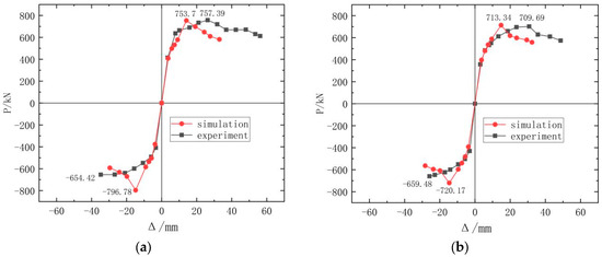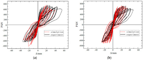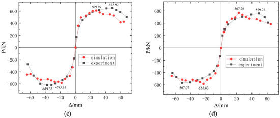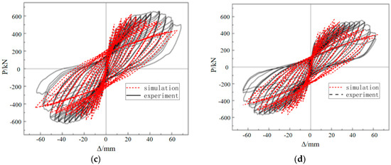 - The finite element model modeling method of sleeve grouting connection prefabricated shear wall for different defects proposed in this paper can better simulate the seismic performance of shear walls, such as yield-bearing capacity, peak bearing capacity, and failure mode. It can also better reflect the ‘pinching’ characteristics of the hysteresis curve. However, it is important to note that the unloading stiffness is lower than the actual stiffness due to the continuous accumulation of plastic damage in concrete under horizontal cyclic loading;