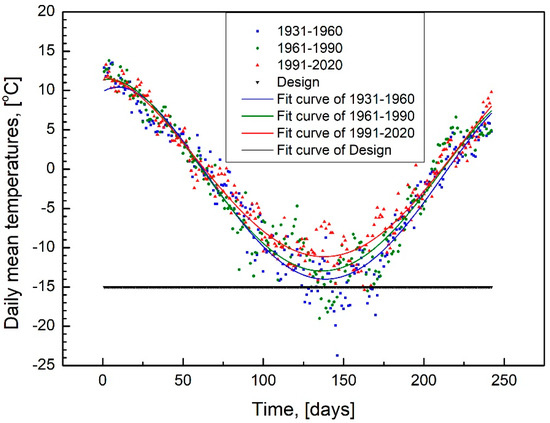 The fit curves were determined using polynomial fit grade 4. As can be observed, there are differences between the daily mean values of the analyzed periods. From the significance analysis at a 0.05 significance level, it was found that there are significant differences among all analyzed periods. The minimum values of the external temperatures shown by the fit curves are −14.00 °C (1930–1960), −12.96 °C (1960–1990), and −11.14 °C (1990–2020). The increase in external temperatures in recent decades has led to lower energy use for heating. This fact has importance in at least three aspects. Most building refurbishments are supported by the municipality, the state, or the European Union. The expected energy savings after refurbishments and the reduction in CO2 emissions should be calculated and provided in the application. Misleading results can be obtained if the energy-performance analysis of a building is based on the outdoor temperatures recorded 40–50 years ago. Another problem is the question of the external design temperature. If the heat demand of a building is calculated based on the external design temperature established almost one hundred years ago, all elements of the heating system will be over-dimensioned. In the last 30 years, the currently valid external design temperature has occurred once.