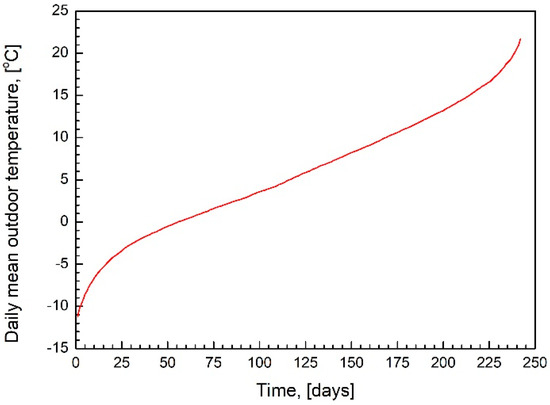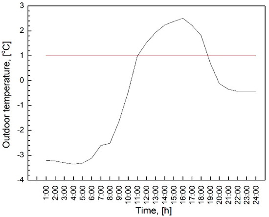The daily variation in the outdoor temperature (Figure 9) can be exploited to obtain a higher seasonal coefficient of performance of the air–water heat pumps. Usually, the heat pump is chosen to cover the heat demand at −15 °C. In the case of days with higher mean temperatures, the output of the heat pump exceeds the heat demand, so with a properly dimensioned buffer tank installed in the heating system, the daily energy needed for heating can be produced during the hours with higher temperatures (for example, temperatures >1.0 °C), obtaining in this way COP values greater than 3.0 (40 °C supply temperature for heating).