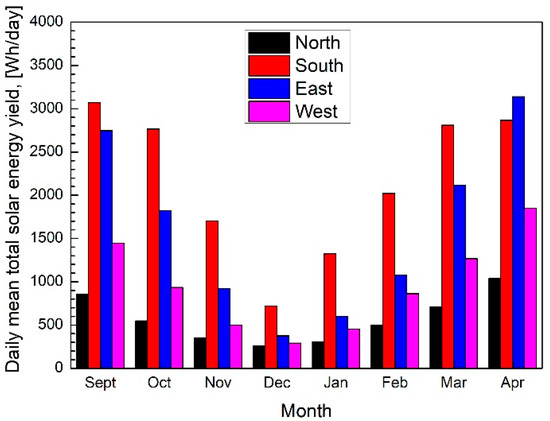 The daily mean solar-energy yield on vertical surfaces (Figure 4) was calculated using the hourly global solar-radiation data provided by Meteorological Observatory, University Debrecen (Hungary) [42]. If the hourly solar-radiation data are not available for a certain location, these can be determined based on the monthly mean global-irradiation data [43].