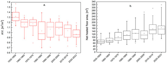 A/V ratio (a) and net heated floor area (b) by year of construction.