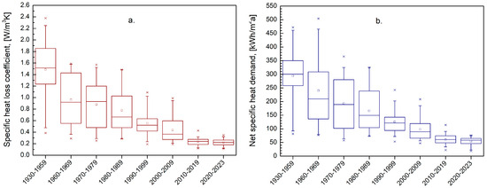 Specific heat loss coefficient (a) and net specific heat demand (b) by year of construction.