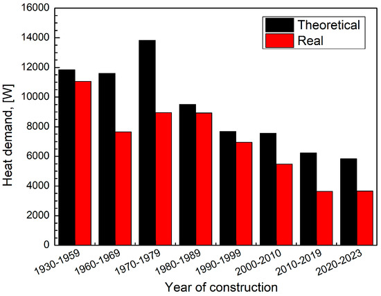 The real heat demand values of the examined buildings are lower than the theoretical values that would be obtained in the case in which the thermal properties of external building elements only meet the requirements valid in the year of construction (Figure 8), which means that some of the investigated buildings have been thermally refurbished at least once (especially for the 1960–1969 and 1970–1979 categories) or that new buildings had better thermal characteristics than required (especially after 2010).