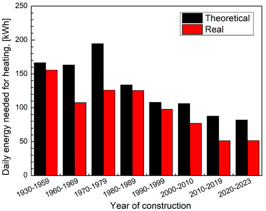 Obviously, in this case, low-temperature radiant heating systems are recommended. Radiant heating systems should not be installed on the external building elements because the increased heat losses of the heating system lead to lower energy performance of the heating process [42]. However, slabs between stories and internal walls can be used for heat storage, but the maximum allowable surface temperatures should be taken into account. Based on the variation in outdoor temperature presented in Figure 8 (daily mean temperature of −0.51 °C) the daily energy demands for heating of the single-family houses built in Debrecen between 1930–2023 were determined (Figure 10).
