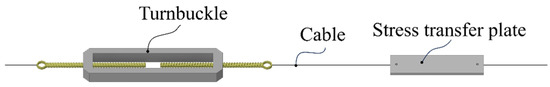The joints of the SLS model were divided into mid-joint and edge-joint, corresponding to the yellow and black joints displayed in Figure 1, respectively. Both mid-joint and edge-joint were designed as cylindrical joints with a diameter of 20 mm, and their design heights were 40 mm and 30 mm, respectively. The connections between the members and joints of the SLS model were achieved through welding. Building on the ordinary SLS model, as shown in Figure 1a, the cable-stiffened SLS model, as shown in Figure 1b, integrated prestressed cables arranged along the grid diagonals, creating a structure with in-plane arranged cables. To effectively apply and accurately measure the prestress in the cables, a prestressed cable system was introduced, as displayed in Figure 2. The system was composed of three parts: stress transmission plates, cables, and turnbuckles. The rectangular stress transmission plates measured 15 mm in length and 2 mm in width; the cables had a diameter of 1.2 mm; the turnbuckles had a minimum length of 50 mm. By incorporating this prestressed cable system into the cable-stiffened SLS model, the magnitude of the prestress applied to the cables could be determined from the stress values obtained through the stress transmission plates, and the magnitude of the prestress could be adjusted by turning the turnbuckles. In the designed cable-stiffened SLS model presented in this paper, the initial prestress magnitude for all cables was set to 100 MPa.