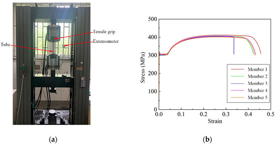 Before conducting the small-scale shake table testing, the material tests were conducted on the seamless steel tubes and cables used in the SLS models to obtain their accurate material properties. The material tests for the seamless steel tubes were conducted on an electronic universal testing machine, as shown in Figure 3a. Five seamless steel tubes from the same production batch as those used in the SLS model were selected for material tests, and the stress-versus-strain curves for these tubes were obtained, as displayed in Figure 3b. The material properties of these five seamless steel tubes, such as the elastic modulus , yield strength , and ultimate strength , can be derived from their stress–strain curves, as listed in Table 2. It could be found that the elastic modulus, yield strength, and ultimate strength of the seamless steel tubes averaged 201.3 GPa, 303.1 MPa, and 405.3 MPa, respectively, with corresponding CoVs of 0.011, 0.008, and 0.011. This indicated that the material properties of the seamless steel tubes selected for this study were quite stable.