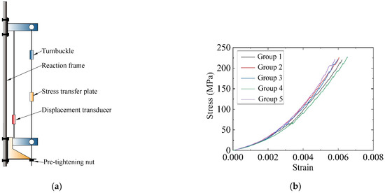 To address the challenge of measuring the elastic modulus of cables, a setup that could be used to measure the elastic modulus of cables was designed, as displayed in Figure 4a. In this setup, turnbuckles were used to tension the cables to be measured, prestress transmission plates were employed to measure the stress in the cables during tensioning, and a displacement gauge was used to measure the axial displacement of the cables during tensioning. Utilizing this measuring setup, the material tensile tests on five cables from the same production batch as those used in the shell model were conducted, and the stress-versus-strain curves for these cables were obtained, as displayed in Figure 4b. The elastic modulus corresponding to these cables could be derived from their stress-versus-strain curves, as listed in Table 3. It was found that the average elastic modulus of these five cables and the CoV were 59.8 GPa and 0.049, respectively, meeting the requirements for the elastic modulus of cables specified in the standard [36].