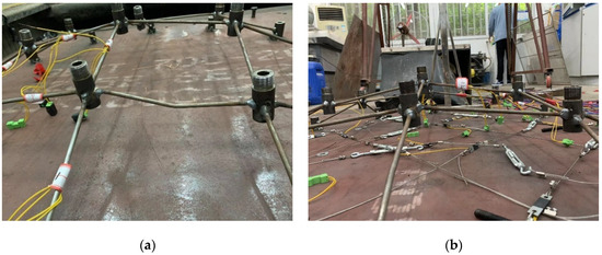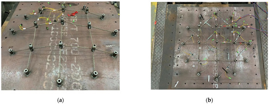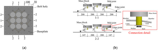 To ensure a stable connection between the SLS model and the shake table, a connecting steel plate was installed at the bottom of the SLS model to guarantee that seismic loads could be steadily transferred to the model, as displayed in Figure 5a. The connecting steel plate had dimensions of 1000 mm in length and width, with a thickness of 10 mm; bolt holes were pre-drilled on the plate with a spacing of 100 mm and a distance of 50 mm from the edges of the connecting plate. M10 bolts were used to connect and secure the connecting steel plate to the surface of the shake table, and the SLS model was fixed onto the connecting plates by welding the edge-joints of the model to the connecting plate. When arranging the prestressed cables, both ends of these cables were connected to the edge-joints via hooks, and the cables were fixed through the mid-joints using bolts and washers. To accurately simulate the effect of the self-weight of the roof panels on the shell structure, the nodal loads were applied to the SLS model by installing mass blocks at the mid-joints, as displayed in Figure 5b. These mass blocks had identical geometric dimensions and material properties, with a diameter of 180 mm, a height of 50 mm, and a mass of 10 kg. Figure 5b shows the details of installing the mass blocks and securing the prestressed cables at the mid-joints: the bolts beneath the mid-joints were tightened, passing through the joints and connecting to the mass blocks above the mid-joints, thus completing the installation and securing of the mass blocks. Simultaneously tightening the bolts also secured the prestressed cables under the effect of the washers beneath the mid-joints, thereby achieving a cross-arrangement of each cable within the grid.