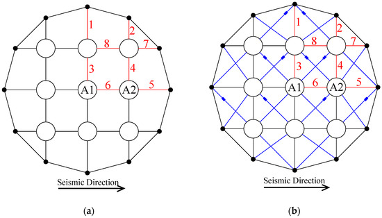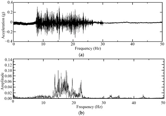 During the test of natural vibration characteristics of the cable-stiffened SLS model, improvements were made to the fixation and connection methods between the model and the monitoring instruments to avoid recurrence of similar issues. After ensuring that the connections were effective and the monitoring instruments could accurately capture the corresponding acceleration values, the cable-stiffened SLS model was subjected to white noise sweep and subsequent tasks. During the white noise sweep, the model exhibited almost no oscillation. The acceleration–time history curve at joint A2 was measured using the accelerometer mounted at that point, as displayed in Figure 11a. Further, this acceleration–time history curve was subjected to FFT to obtain the corresponding power spectral density curve, as displayed in Figure 11b. It was observed that the first few natural frequencies of the cable-stiffened SLS model were concentrated between 13 Hz and 17 Hz, indicating a dense modal pattern. Specifically, the first and second natural frequencies of the cable-stiffened SLS model were identified as 13.24 Hz and 13.71 Hz, respectively. Comparing the ordinary SLS model with the cable-stiffened SLS model, the distribution of the first two natural frequencies of the latter was more concentrated. Moreover, compared to the ordinary SLS model, the first and second natural frequencies of the cable-stiffened SLS model increased by 51.31% and 41.05%, respectively. This suggested that the introduction of prestressed cables could effectively enhance the stiffness of the SLS structures, thereby improving its stability and seismic resistance. Additionally, following the same method used to establish the finite element model for the ordinary SLS, a high-precision finite element model for the cable-stiffened SLS was created. The first-order natural vibration mode obtained from the analysis is shown in Figure 10b. The calculated first-order natural frequency is 15.26 Hz. Compared to the test results, there is a difference of 2.02 Hz in the natural frequency between the finite element analysis and the test. This discrepancy is due to the finite element model aligning the mass block directly with the joints in the latticed shell, whereas in the test model, the mass block was fixed above the joint with a bolt, resulting in a positional difference of the mass block. Despite this, the natural frequency from finite element analysis still falls within the concentration range of the first few natural frequencies of the test model (previously mentioned as 13–17 Hz). Therefore, it can be considered that the established finite element model is relatively accurate, which also indicates that the natural frequencies of the ordinary SLS obtained using finite element analysis are reliable.