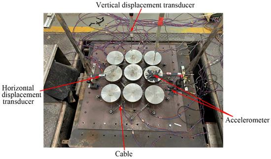 This study conducted dynamic response tests on an ordinary SLS model and a cable-stiffened SLS model using a small-scale shake table. The objective was to compare and investigate the impact of prestressed cables on the seismic performance of the SLS models. The experimental content included testing the natural vibration and dynamic characteristics of the SLS models. Therefore, during the testing process, it was necessary to monitor and record response parameters of the SLS models, including structural displacement and acceleration responses, as well as member deformation and plastic development. The arrangement of measurement points and devices for this study is shown in Figure 6. Two mid-joints, A1 and A2, of the SLS model were selected as displacement measurement points. Before conducting the shake table testing, two displacement transducers were placed in both horizontal and vertical directions at mid-joints A1 and A2, respectively, to measure and record the horizontal and vertical displacements occurring at these joints during the tests, totaling four displacement transducers. Additionally, one accelerometer was placed horizontally at mid-joint A2 and at the shake table surface to record the horizontal acceleration magnitude of the latticed shell model at these points during the tests, totaling two accelerometers. The strain gauges were also installed on eight members of the SLS model to measure their strain variations during loading. The identification numbers and locations of these eight members are displayed in Figure 6. For the cable-stiffened SLS model, the stress in the prestressed cables was measured by corresponding stress transmission plates, with the arrangement method and locations of these plates displayed in Figure 2 and Figure 6b. Taking the cable-stiffened SLS model as an example, the actual setup of the SLS model and measurement devices is displayed in Figure 7. Before starting the small-scale shake table testing, the sampling frequency for all sensors was set to 100 Hz.