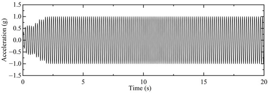 For this study, an electro-hydraulic servo-controlled shaking table was employed, with a table surface measuring 1.2 m long and 1.2 m wide. The maximum payload capacity of the shaking table is 1000 kg. In the horizontal direction, the shaking table can achieve a maximum acceleration of , a maximum velocity of 0.5 m/s, and a maximum displacement of 100 mm. Within the operational limits of the shaking table, the small-scale shake table testing conducted in this study consisted of two parts: tests of natural vibration characteristics and dynamic characteristics, with the loading scheme listed in Table 4, where work condition 1 corresponded to the test of natural vibration characteristics, while the remaining conditions corresponded to the test of dynamic characteristics. During the natural vibration characteristics test, a white noise excitation was input into the SLS model, as displayed in Figure 8. Using the dynamic data acquisition system to collect the time history curve of the SLS model, the time domain signal output from the time history curve could be converted into a frequency domain signal through Fast Fourier Transform (FFT). The natural frequencies of the SLS model could then be determined by the peak frequencies corresponding to the power spectral density curve which was obtained by FFT. For the dynamic characteristics test, a 6 Hz sinusoidal wave was input into the SLS model instead of an actual recorded seismic wave. An acceleration amplitude of for the 6 Hz sinusoidal wave is shown in Figure 9. Different acceleration amplitudes were selected for the dynamic characteristics test under different work conditions. Work conditions 2 to 5 used acceleration amplitudes of , , , and , respectively, aiming to obtain the dynamic responses of both the ordinary SLS model and the cable-stiffened SLS model during the elastic stage; work condition 6 used an acceleration amplitude of 1.8 g to observe the dynamic responses and failure modes of the two types of SLS models during the plastic stage.
