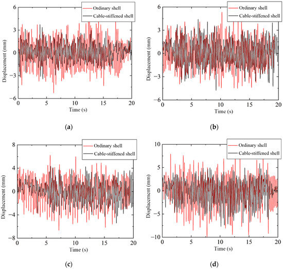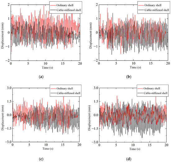 - With increasing acceleration amplitude, the vertical vibration of the ordinary SLS was significantly greater than that of the cable-stiffened SLS, but the horizontal vibration of the ordinary SLS was slightly less than that of the cable-stiffened SLS. This was because the introduction of prestressed cables led to a more uniform distribution of internal forces in the cable-stiffened SLS under strong seismic actions, improving the overall stress condition of the structure and thus reducing vertical vibrations. This indicated that the arrangement of cables could still reduce the overall vibration of the SLS.