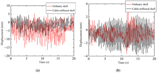 Table 5 lists the maximum micro-strain of eight characteristic members of the two SLS models under an earthquake time history with an acceleration amplitude of . For the ordinary SLS model, the maximum micro-strain of five members exceeded the yield strain, resulting in a plastic member ratio of 62.5%, whereas the cable-stiffened SLS model had a plastic member ratio of only 25%. Compared to the ordinary SLS model, the plastic member ratio of the cable-stiffened SLS model under the extremely high load of acceleration amplitude decreased by 60%, consistent with the member deformation scenarios displayed in Figure 15. Figure 16 shows the displacement–time history curves at joint A2 for the two SLS models under work condition 6. With an acceleration amplitude of , the vertical and horizontal displacements at joint A2 of the two SLS models showed significant differences. The maximum horizontal displacement for both SLS models did not exceed 4 mm. In contrast, the maximum vertical displacement for the cable-stiffened SLS model was 8.3 mm, while that for the ordinary SLS model reached 16.5 mm. This indicates that under the load of acceleration amplitude in work condition 6, the vertical dynamic response of the two SLS models still played a dominant role compared to the horizontal dynamic response, consistent with the phenomenon observed in work conditions 2 to 5. Moreover, comparing the maximum vertical displacement of the two SLS models revealed that the maximum displacement of the cable-stiffened SLS model was significantly reduced by about 50% compared to the ordinary SLS model, aligning with the overall deformation scenarios displayed in Figure 17. It can be concluded that introducing prestressed cables into SLS structures can effectively enhance the stiffness, stability, damping capacity, and seismic resistance of the structure, significantly reducing overall deformation and ensuring the integrity and safety of the SLS structure under extreme conditions.