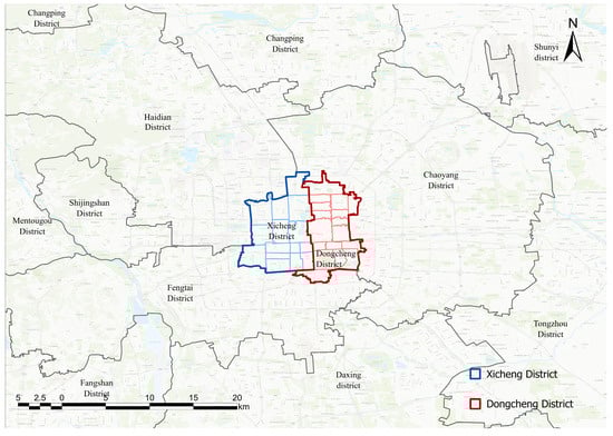The Dongcheng and Xicheng Districts of Beijing cover areas of 41.84 km2 and 50.7 km2, respectively, forming the core functional area of the capital [45]. These two districts, with their high residential population density and relatively well-developed public service facilities, are the most central and developed areas in Beijing (Figure 1). The aging rates in Dongcheng and Xicheng Districts are 27.0% and 26.9%, respectively [46], which rank the highest over the 16 districts in Beijing, significantly higher than the average aging rate. Compared to other areas in Beijing, the mismatch between supply and demand for elderly care facilities is particularly prominent in those two districts, reflecting the aging issue in the core urban areas of large Chinese cities.