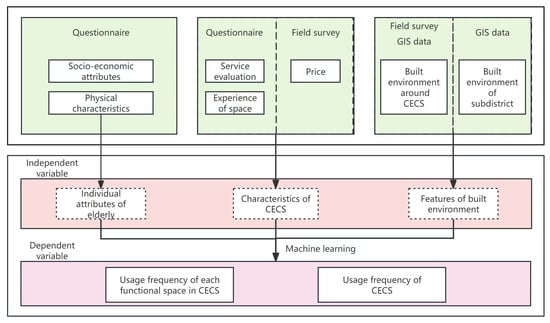 This study examines the important factors affecting the frequency of elderly usage of CECSs through the characteristics of the elderly, the CECSs, and their built environments. The specific research framework is illustrated in Figure 3.