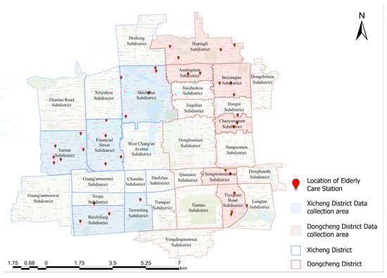 Dongcheng District includes 17 subdistricts, and Xicheng District has 15. This study randomly selected 12 subdistricts across both districts for data collection. Subdistricts are the minimum administrative units of a district, directly responsible for residential area and service facility management. Local residents usually prefer services within their residential subdistrict due to spatial accessibility and financial subsidies.