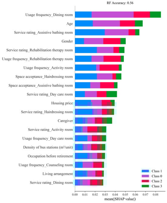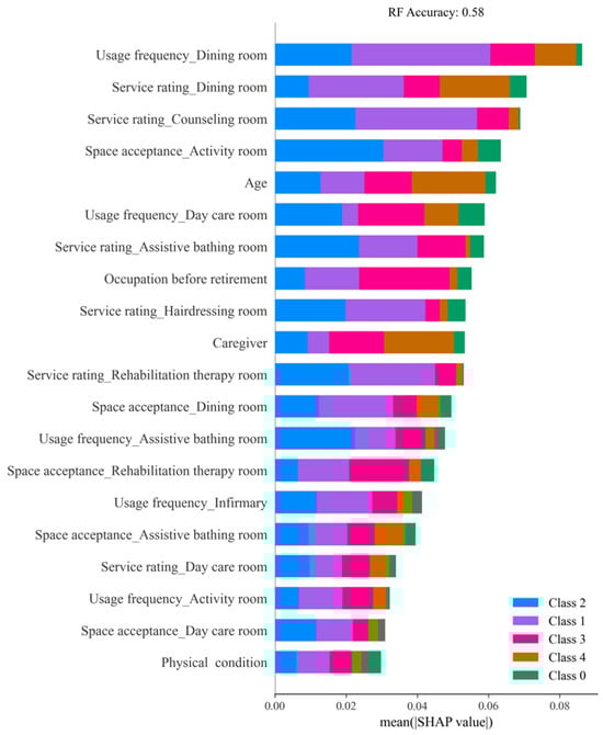 Specifically, the most crucial influencing factor within CECS features is the usage frequency of the dining room, followed by the service ratings of the assistive bathing room and rehabilitation therapy room, usage frequency of the rehabilitation therapy room and activity room, and space acceptance in the hairdressing room and assistive bathing room. These results highlight that spaces such as dining rooms, assistive bathing rooms, and rehabilitation therapy rooms receive particular attention from the elderly, and space acceptance, service quality and usage frequency collectively influence the overall usage frequency of CECS. Age is the second most important factor (Figure 5), which belongs to elderly individual attributes, indicating variability in usage among different age groups.