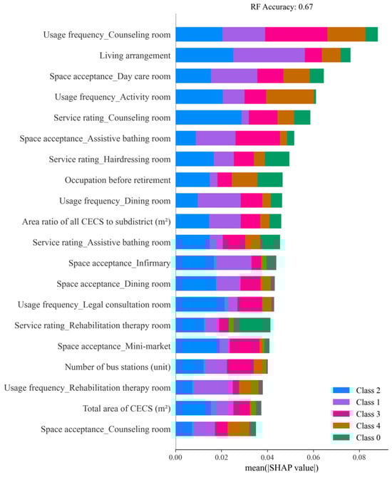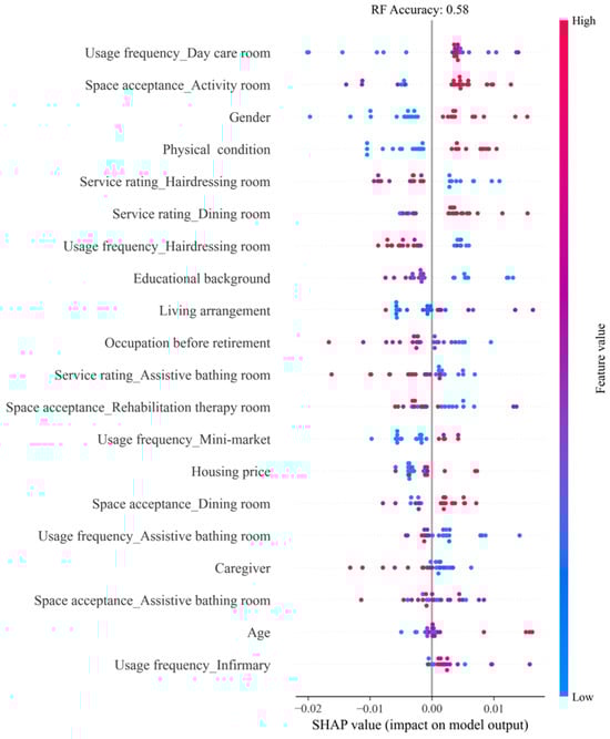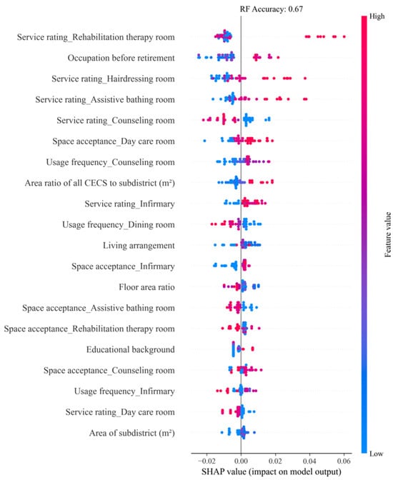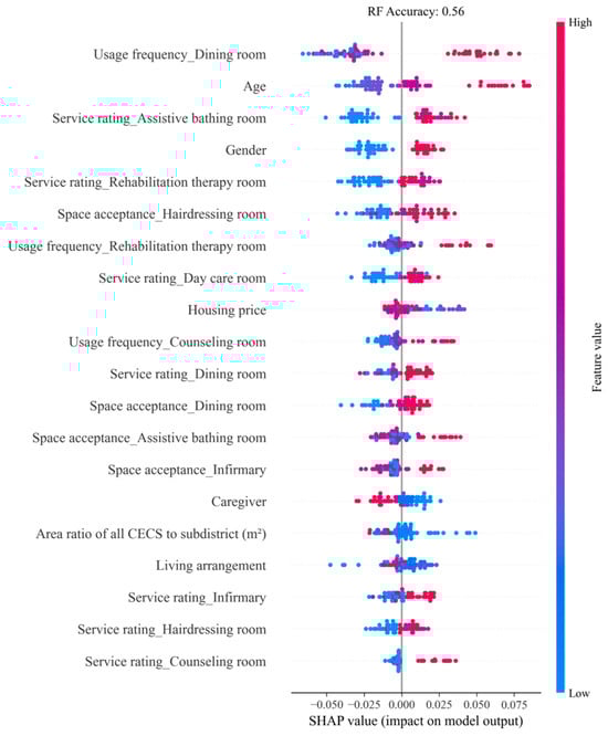 The SHAP scatter plot (Figure 6) shows the trends between the top 20 important influencing factors and the overall usage frequency. In the category of CECS features, a higher service rating in the assistive bathing room, rehabilitation therapy room, and daycare room correlates with higher overall usage frequency. Similarly, user experiences (hairdressing room and dining room) and the usage frequency of certain spaces (rehabilitation therapy room, counseling room, and dining room) also positively correlate with the overall usage frequency. The positive correlation between age and usage frequency suggests that as the elderly become older, their demand for the service from CECS increases.