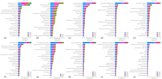 Figure 11. Ranking of the importance of factors influencing usage frequency in functional space, (a). Daycare room; (b). Activity room; (c). Dining room; (d). Rehabilitation therapy room; (e). Counseling room; (f). Infirmary; (g). Legal consultation room; (h). Hairdressing room; (i). Assistive bathing room; (j). Mini-market.