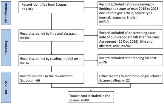 “Scopus” database was used to search and identify the publications using keywords: (“Building Industry” OR “Building Sector” OR “Built Environment”) AND (Emission* OR “Energy-efficient” OR “Low-carbon” OR “Nearly zero-carbon” OR “Net zero-carbon” OR “Zero-carbon” OR “Carbon-negative”) AND (Challenge* OR Barrier* OR Obstacle*). Initially, the search engine presented 1103 records, and by limiting the results to journal articles in the English language published between 2015 and 2023, 384 articles were identified. In the next step, the title, abstract, and date of publication were screened to evaluate their relevance to the scope of this study in terms of content and time period (from 12 December 2015, when the Paris Agreement was signed, to the end of 2023) which led to the exclusion of 242 records. Subsequently, the remaining 142 records were screened by reading the full text, and only 66 records were found relevant to the scope of this review.