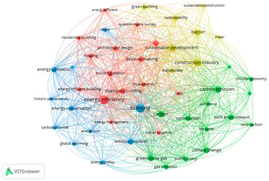 Furthermore, keyword occurrence analysis was conducted to understand the major themes discussed in the literature. For this purpose, both author keywords and index keywords, which were extracted from the Scopus database for the relevant articles, were analysed using VOSviewer 1.6.20 software. The same words in singular and plural form were combined to provide a more accurate result. By limiting the minimum number of occurrences to five times, 48 keywords met the criteria. The most frequently occurring keywords include “building” = 33 times, “energy efficiency” = 32 times, “construction industry” = 21 times, “sustainable development” = 20 times, and “carbon emission” = 17 times. The keyword occurrence map is presented in the figure below (Figure 3).