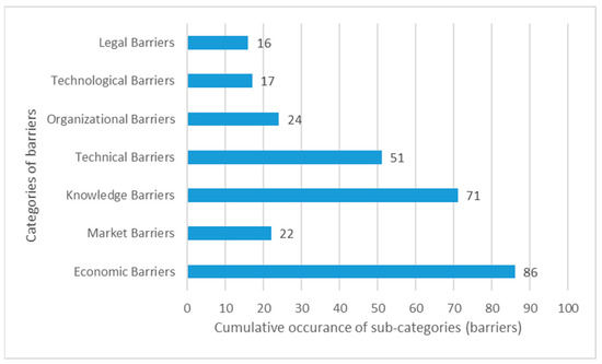 The cumulative occurrence of barriers under each category, as illustrated in Figure 4, indicates that “economic”, “knowledge”, and “technical” barriers are, respectively, the most discussed categories within the scope of our research in selected articles.