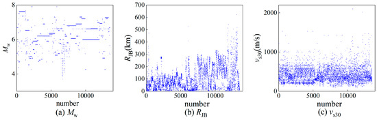 The earthquake ground motion records utilized in this study were sourced from the NGA-West2 database of the Pacific Earthquake Engineering Research Center (PEER). A total of 13,556 horizontal earthquake acceleration records from 200 earthquakes was gathered. Figure 1 illustrates the distribution of moment magnitude (), Joyner–Boore distance (), and average shear-wave velocity to a depth of 30 m () for the 13,556 earthquake ground motion records. The Mw values range from 3.7 to 7.9, the RJB spans from 0 km to 620.78 km, and vs30 varies between 89.32 m/s and 2100 m/s. Notably, the selected data encompass a broad range of Mw, RJB, and vs30 values, allowing for the comprehensive consideration of source characteristics, propagation path, and local site ground motion spectral features.