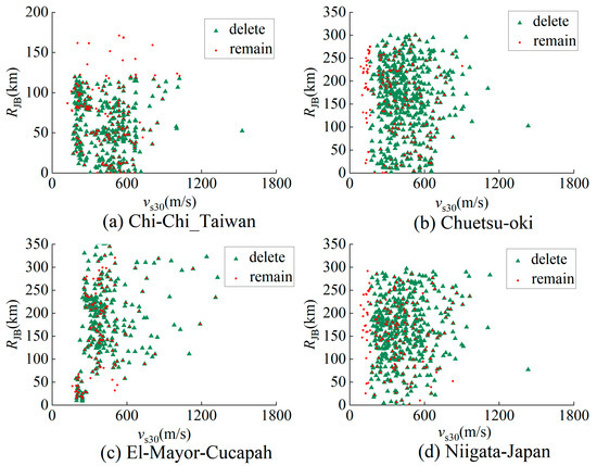 According to Equation (1), earthquake ground motion records with a moment magnitude less than 6 are excluded from the database if their corresponding Joyner–Boore distance exceeds 150 km and their peak ground acceleration is lower than 0.002 g. Similarly, for earthquake ground motion records with a moment magnitude greater than or equal to 6, exclusion criteria apply if their corresponding Joyner–Boore distance exceeds 400 km and their peak ground acceleration is lower than 0.002 g. Subsequently, some records were excluded for specific earthquake events to address disparities in record quantity. The number of earthquake ground motion records observed for each event varies significantly. Some earthquakes yield thousands of records, while others have only single-digit counts. Records from individual earthquakes with an exceptionally high count were further screened and subsequently excluded to mitigate the disproportionate influence of these events. During the second round of exclusion, the s and s of the remaining records were distributed as widely as possible within the original range. Figure 2 presents the exclusion results for four earthquakes: Chi-Chi, Chuetsu-oki, El-Mayor-Cucapah, and Niigata-Japan. Following the exclusion processes, 7627 earthquake ground motion records were retained for further research.