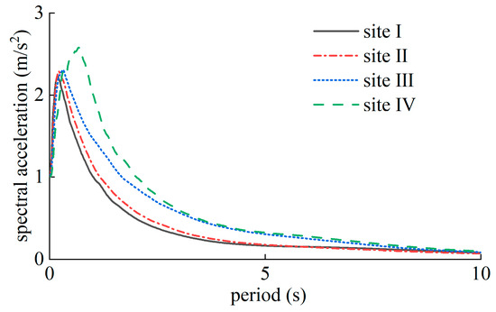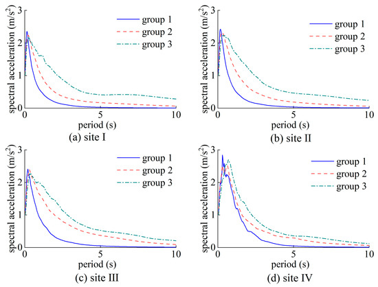 The earthquake acceleration time histories recorded are linearly modulated, with the peak acceleration normalized to 1 m/s2. Following this normalization process, the average acceleration response spectra of the normalized acceleration time histories for the four site categories are depicted in Figure 6. It is important to note that this average acceleration response spectrum, derived from the normalized earthquake accelerations, serves as a reflection of spectral characteristics, as the influence of the peak acceleration has been effectively eliminated. As depicted in Figure 6, significant variations are evident among the average acceleration response spectra of the three cluster groups within each site category. Notably, the long-period component of earthquake ground motions increases with both and , with a discernible rise from site I to site IV. These clustering results underscore the influence of magnitude, propagation distance, and site conditions on the spectral properties of earthquake ground motions.