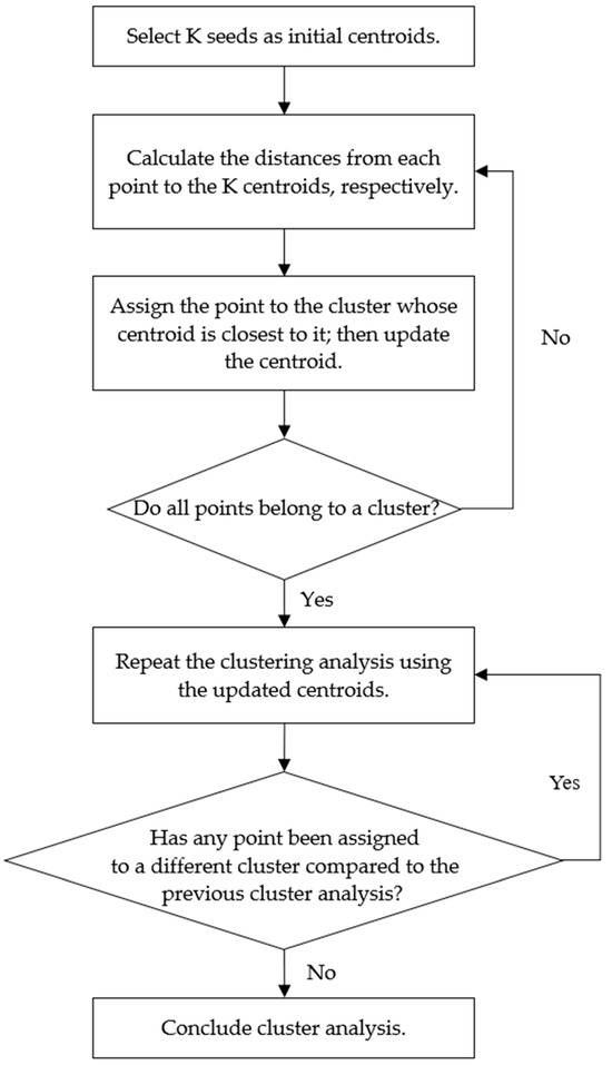 K-means stands out as one of the most widely utilized cluster analysis algorithms, where the parameter “K” signifies the user’s specified number of clusters. In this method, the initial K centroids, say the initial seeds, are first determined randomly. Subsequently, each point is assigned to the closest centroid, with the Euclidean distance serving as the measure of proximity. The centroid is updated each time a new point is assigned to the cluster, effectively representing the mean of the points within that group. The initial cluster analysis concludes once all points have been assigned to clusters. Subsequently, the analysis iterates with updated centroids until the clusters stabilize, meaning each point remains assigned to the same cluster as in the previous iteration. The primary steps of the K-means cluster analysis algorithm are outlined in Figure 4.