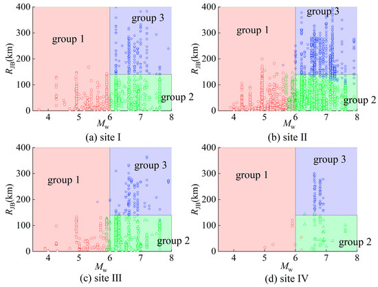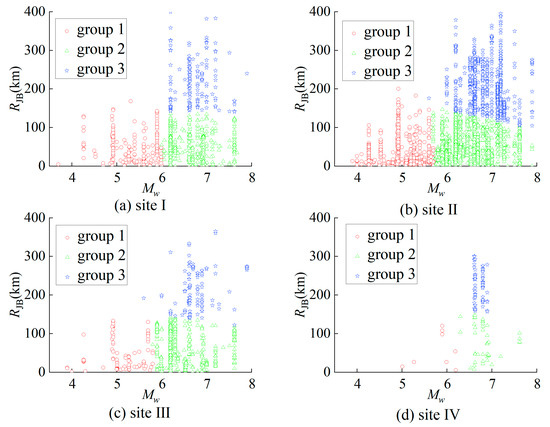 The earthquake ground motion records obtained from the four types of sites were subjected to independent clustering procedures, each performed four times for every site category. For each clustering analysis, the maximum of records in the first cluster group () and the minimum value in the second cluster group (), as well as the maximum in the second cluster group () and the minimum value in the third cluster group (), were calculated. Utilizing these data, the range of the boundary and the boundary for each site type were initially determined. The range of the boundary between group 1 and group 2 is or , while the range of the boundary between group 2 and group 3 is or . The ranges of boundaries for earthquake ground motion records of the four sites are displayed in Table 4. However, it should be noted that inconsistencies were observed in the distribution of records within the third and fourth clusters of site IV, particularly concerning the patterns observed in small, large, and distant earthquakes. Due to these anomalies, the results derived from these two clusters were deemed unreliable and were consequently disregarded in the subsequent analysis.
