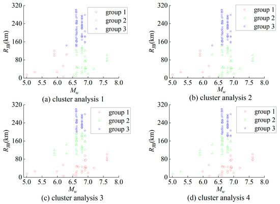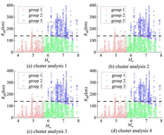 As indicated in Table 4, the boundary between group 1 and group 2 is approximately 6, exhibiting minimal fluctuation. Meanwhile, the boundary between group 2 and group 3 is consistently around 140 km for the earthquake ground motion records of sites I, III, and IV. However, for site II, the boundary between group 2 and group 3 displays a broader range. The clustering results of earthquake ground motion records for site II, conducted four times, are illustrated in Figure 9. The vertical coordinate of the dashed horizontal line in Figure 9 is 140 km. It is noteworthy that earthquake ground motion records belonging to group 3, with a lower than 140 km, are relatively sparse. Additionally, these records with a lower than 140 km are contiguous with the records of group 2. Consequently, the boundary between group 2 and group 3 for site II is also established at 140 km. In summary, the boundary between group 1 and group 2 for all sites is consistently set at 6, while the boundary between group 2 and group 3 for all sites is uniformly set at 140 km.