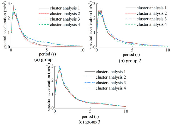 Additionally, the spectral characteristics of earthquake ground motions within clustered groups were analyzed across four repeated clustering analyses conducted on records from site IV. The average acceleration response spectra were computed and compared for all cluster groups, as depicted in Figure 8. The analysis unveiled noteworthy discrepancies in spectral accelerations, particularly in the long-period range, among the earthquake ground motions within group 1. Disparities of up to fivefold were observed across the four repeated clustering analyses. Conversely, the response spectra of earthquake ground motions in group 3 exhibited a minimal variation. The differences in response spectra for earthquake ground motions in group 2 fell between those of group 1 and group 3. These findings align with the observations presented in Figure 6, indicating substantial fluctuations in the distribution of cluster samples within group 1, relative stability within group 3, and intermediate behavior within group 2.