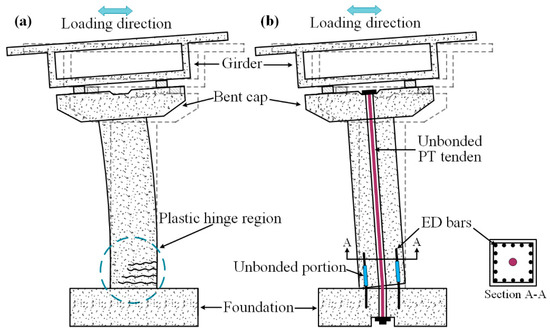 Schematic diagram of typical bridge piers: (a) monolithic bridge pier; (b) PT rocking bridge.
