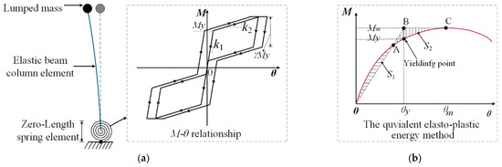The typical LP model of PT rocking piers: (a) LP model; (b) equivalent elastic–plastic energy method.