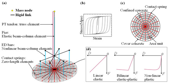 PT rocking pier: (a) the MCS model, (b) stress–strain relationship for ED bars, (c) rocking interface, and (d) three types of F-D relationship for the contact springs.