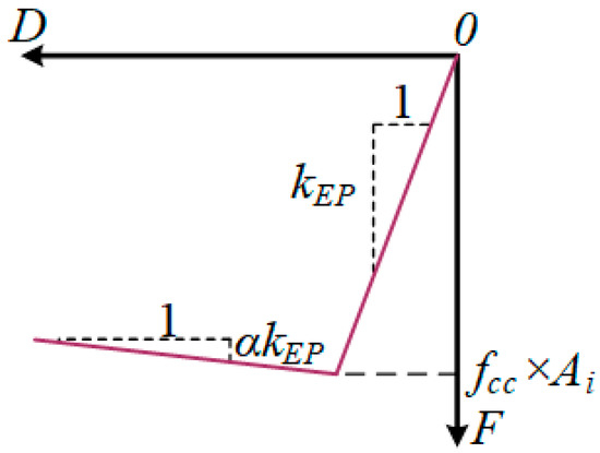 The post-yielding stiffness of the MSC-EP model can be set as αkEP_i; thus, the “Elastic-Perfectly Plastic Gap” material with the gap = 0 is used to simulate the MCS-EP model. Figure 8 shows the typical F-D relationship of the MSC-EP contact spring, which is derived from the stress–strain behavior, where fcc is the peak strength of the pier base concrete; from the figure, it can be seen that the force of the contact spring is obtained by multiplying the yield stress fcc by the Ai.