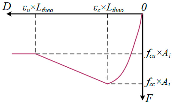For the MCS-NP model, the behavior of the contact spring is simulated by the “Concrete01” material [9,35], which also needs to be converted into the F-D relationship, as shown in Figure 9. In the F-D relationship, the contact force is related to the contact unit area Ai; while the contact deformation is transformed from the strain (i.e., the peak strain εc and ultimate strain εu) amplified by the theoretical neutral–axial depth Ltheo.