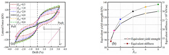 The effect of βLE on the hysteretic behavior of PT rocking piers based on the MCS−LE model: (a) lateral force−drift relationship; (b) equivalent yield strength and stiffness.