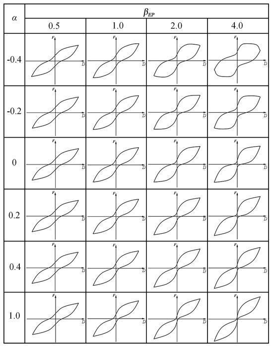βEP and α have an important influence on the cyclic response of PT rocking piers in the MCS−EP model. Figure 11 shows the general trend of the effect of these two parameters on the cyclic behavior of PT rocking piers. The variation ranges for βEP and α are [0.5, 4.0] and [−0.4, 1.0], respectively. Note that the MCS−EP model with a value of α =1.0 is equivalent to the MCS−LE model. Additionally, to enhance clarity and provide a more comprehensive interpretation of the individual effects of βEP or α, the influences of the single βEP (i.e., α = 0) and the single α (i.e., βEP = 2) on the force–drift relationship of the PT rocking pier using the MCS−EP model are presented in Figure 12 and Figure 13, respectively.
