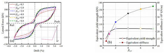 The effect of βEP (α = 0) on the hysteretic behavior of PT rocking piers based on the MCS−EP model: (a) lateral force−drift; (b) equivalent yield strength and stiffness.