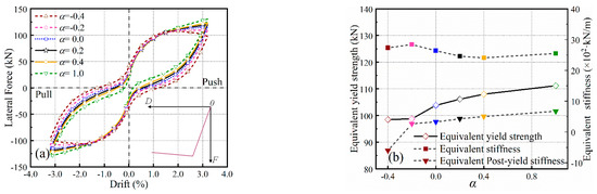 The effect of α (βEP = 2) on the hysteretic behavior of PT rocking piers based on the MCS−EP model: (a) force–drift relationship; (b) equivalent yield strength, initial stiffness, and post−yield stiffness.