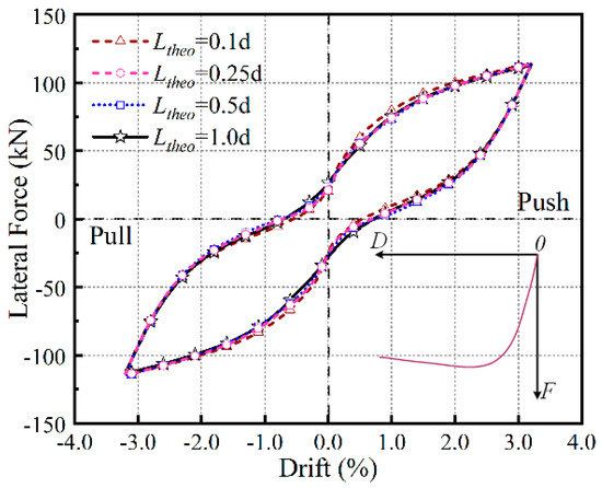 According to Section 2.3.3, Ltheo is a key parameter to calibrate the force–displacement relationship of the MCS-NP model; thus, four Ltheo values (0.10d, 0.25d, 0.5d, and 1.0d) were selected to identify its effect on the hysteretic behavior of the pier. Note that among the four selected values, Ltheo = 0.25d is recommended by Guerrini et al. [35]. Figure 14 depicts the effect of Ltheo on the lateral force–drift relationship of the PT rocking piers based on the MCS-NP model. Evidently, the hysteresis curves among the four Ltheo values are almost identical, indicating that the effect of Ltheo on the cyclic response of PT rocking piers is limited. The lateral forces at 3.2% target drift for the cases of 0.1d, 0.25d, 0.5d, and 1.0d are all close to 114 kN, respectively, in the push direction and to 113 kN, respectively, in the pull direction. As a result, Ltheo = 0.25d was adopted to calibrate the force–displacement relationship of the MCS-NP model.