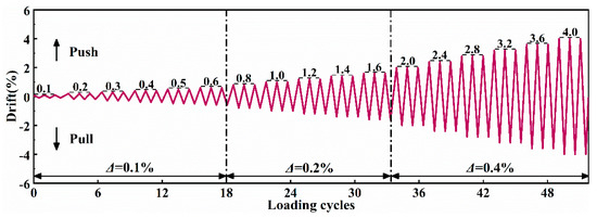 The appropriate values of contact parameters (e.g., βLE and βEP) are essential for the numerical models to accurately capture the cyclic response of PT rocking piers. In this section, the effectiveness of the four numerical models and their appropriate contact parameter values to reproduce the actual cyclic response of PT piers are evaluated. Specimen I tested under quasi-static loading was selected as the research target, and the recorded test results were used as the comparison benchmark. The drift (displacement)-control lateral cycle protocol is shown in Figure 15, which includes 17 increasing levels (up to 4.0% drift), with each level repeated three times. In addition, the fundamental period of the test specimen is measured as 0.38 s, and the periods of four numerical models are 0.37 s, this being close to the period of the test specimen. It should be noted that the periods of four numerical models are identical because the lateral stiffness of the pier is merely provided by the elastic deformation of the column shaft before rocking.