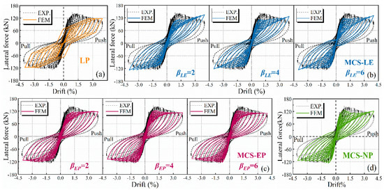 Comparison of the force–drift behavior between experimental and numerical results using: (a) the LP model; (b) the MCS−LE model with three typical βLE values; and (c) the MCS−EP model with three typical βEP values; (d) the MCS−NP model.